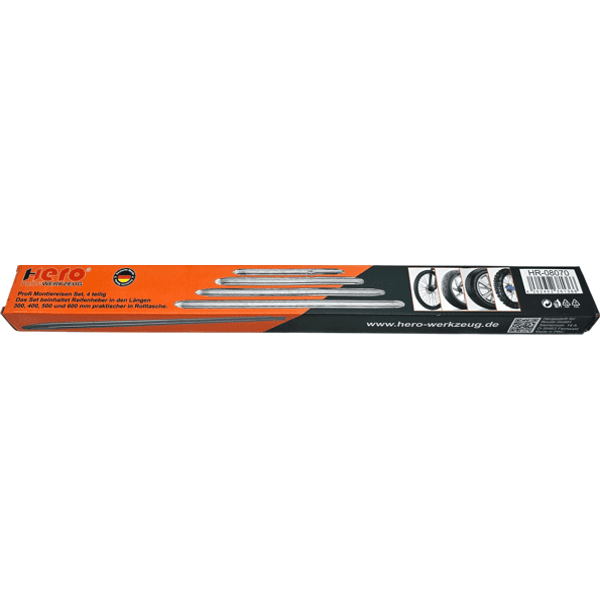Das HERO Professional Montiereisen-Set besteht aus vier hochwertigen Hebelstangen in den Größen 300 mm, 400 mm, 500 mm und 600 mm und eignet sich ideal für unterschiedlichste Anwendungen in Werkstatt und Garage.