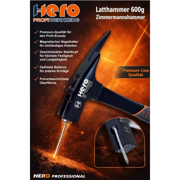 - 1× HERO PROFESSIONAL Latthammer / Zimmermannshammer mit Magnet – Premium-Line